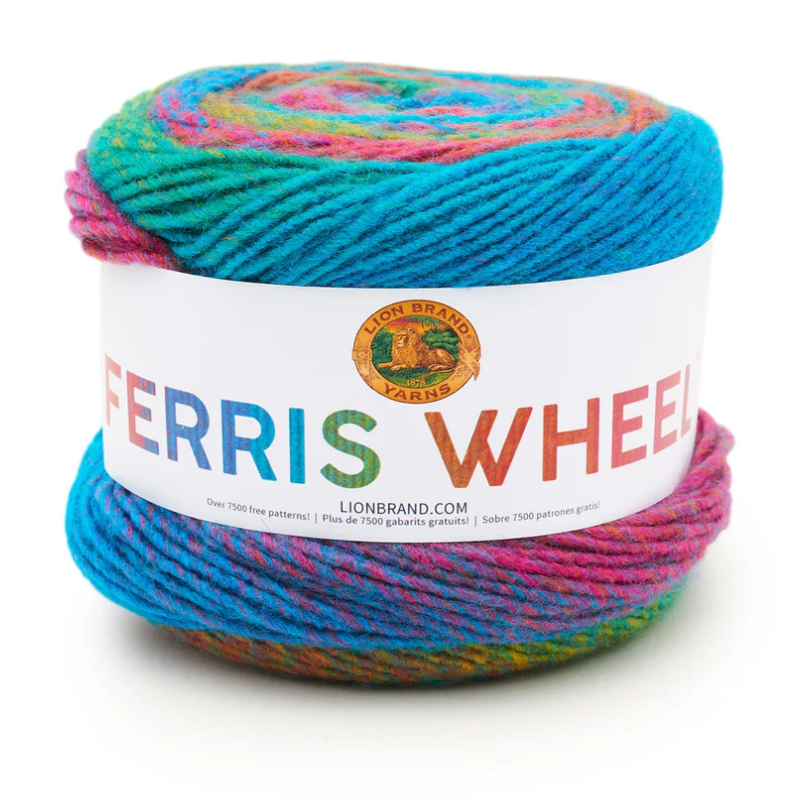 Ferris Wheel is a self-striping, worsted-weight roving acrylic yarn with mesmerizing color transitions and a subtle ombré effect. Each 270 yard cake is perfect for knit or crochet scarves, shawls, lightweight sweaters, and artistic accessories. The smooth, soft fiber glides easily on hooks and needles, ensuring effortless stitching. Machine washable and dryable for long-lasting vibrancy.